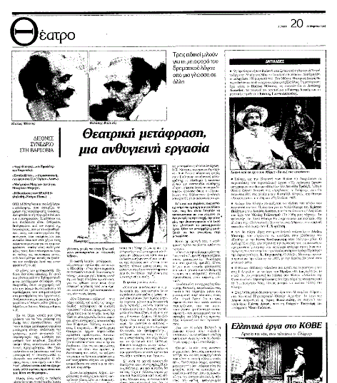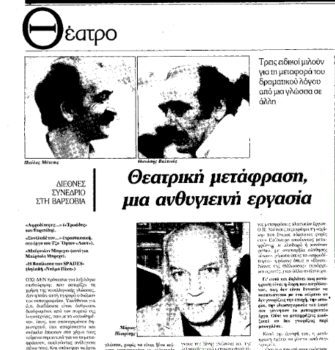 *Απόσπασμα από δημοσίευμα του «Βήματος» που είχε κυκλοφορήσει την Κυριακή 24 Μαρτίου 1985. Το άρθρο, που έφερε την υπογραφή της καλλιτεχνικής συντάκτριας Ελένης Πετάση, είχε τον τίτλο «Θεατρική μετάφραση, μια ανθυγιεινή εργασία» και τον υπέρτιτλο «Τρεις ειδικοί μιλούν για τη μεταφορά του δραματικού λόγου από μια γλώσσα σε άλλη».