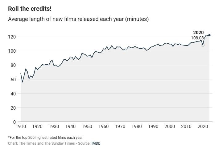 Έρευνες έχουν δείξει ότι το 2022 η μέση διάρκεια μιας ταινίας είχε αυξηθεί κατά σχεδόν ένα τρίτο, φτάνοντας τα 107 λεπτά, από 81 λεπτά τη δεκαετία του 1930.