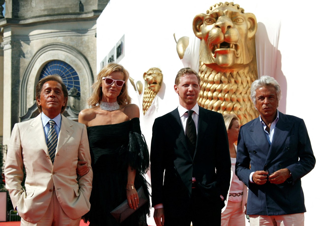Ο Ιταλός σχεδιαστής μόδας του οίκου Valentino ποζάρει με το μοντέλο Εύα Χερτζίκοβα, τον Αμερικανό σκηνοθέτη Matt Tyrnauer και τον σύντροφο του, Τζιανκάρλο Τζιαμέτι, κατά την άφιξή τους στην πρεμιέρα της ταινίας «Valentino: The Last Emperor» του Tyrnauer στη Βενετία, στις 28 Αυγούστου 2008. REUTERS/Denis Balibouse