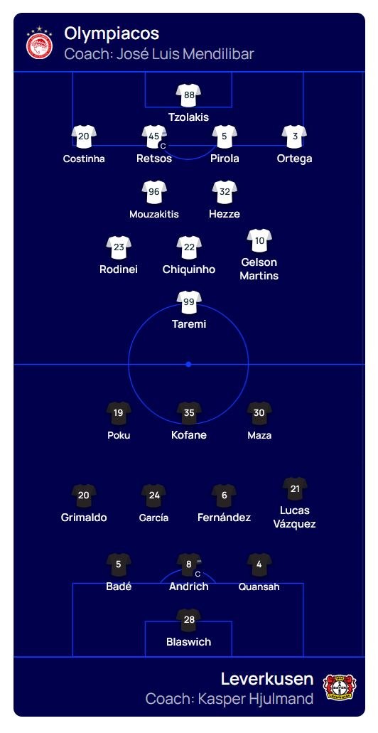 Αυτοί είναι οι 11 που ξεκινούν για τον Ολυμπιακό στο κρίσιμο ματς της της 7ης αγωνιστικής της League Phase του Champions League απέναντι στη Λεβερκούζεν.