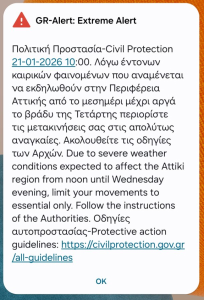 Όπως αναφέρεται στο μήνυμα, αναμένονται έντονα καιρικά φαινόμενα στην Περιφέρεια Αττικής από το μεσημέρι έως αργά το βράδυ της Τετάρτης. Οι πολίτες καλούνται επίσης να ακολουθούν τις οδηγίες των Αρχών, προς αποφυγήν περαιτέρω προβλημάτων.