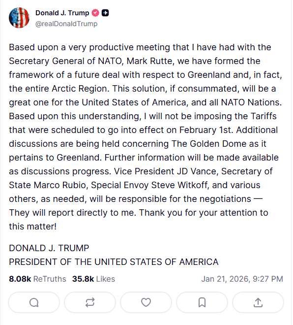 Όπως αναφέρει το ΑΠΕ-ΜΠΕ, λίγες ώρες νωρίτερα, κατά τη διάρκεια της ομιλίας του στο Νταβός, απέκλεισε για πρώτη φορά τη χρήση στρατιωτικής βίας για να πάρει τον έλεγχο της Γροιλανδίας, αλλά ζήτησε «άμεσες διαπραγματεύσεις» για την απόκτησή της από τις ΗΠΑ.
