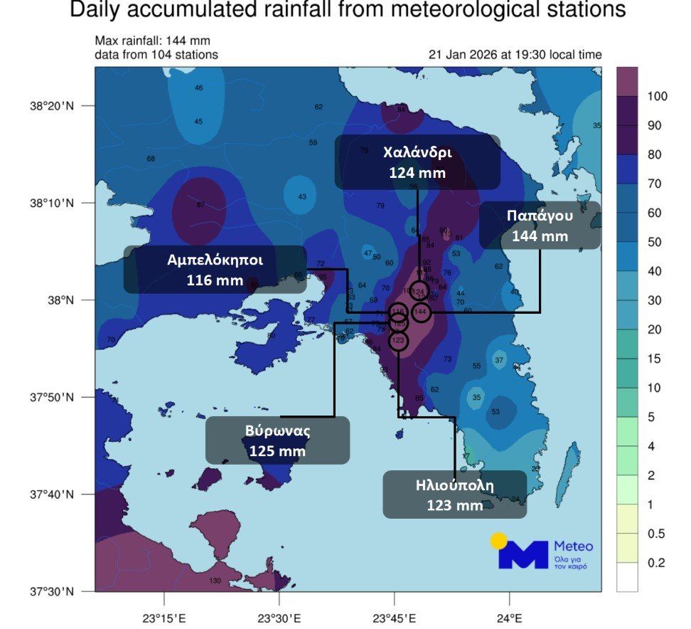 Σύμφωνα με το δίκτυο αυτόματων μετεωρολογικών σταθμών του Εθνικού Αστεροσκοπείου Αθηνών / Meteo.gr τα μεγαλύτερα ύψη βροχής μέχρι τις 20:00 ήταν στην περιοχή Παπάγου Αττικής (146.4mm), στην Τακτικούπολη Τριζοινίας (130.4mm) και στον Βύρωνα Αττικής (126.4mm).