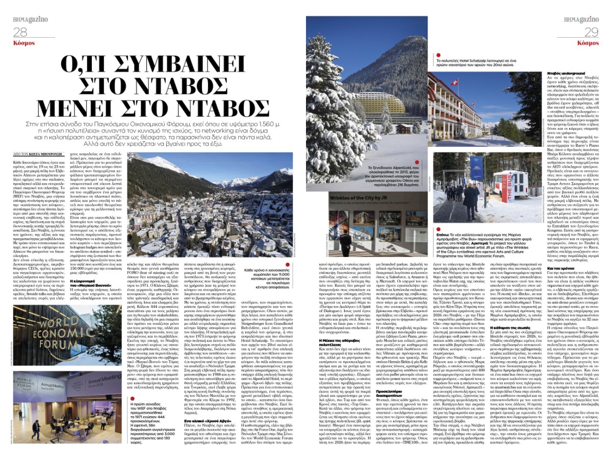 Ακόμη, το BHMAGAZINO ρίχνει φως στα αθέατα παρασκήνια του Νταβός, εκεί όπου η «ήσυχη πολυτέλεια» συγκατοικεί με τον κυνισμό της ισχύος, και τίποτα –ή σχεδόν τίποτα– δεν πρέπει να διαρρεύσει προς τα έξω. Ταξιδεύει στα άκρα της τεχνολογικής πολυτέλειας με ένα jet που υπόσχεται τον γύρο του κόσμου χωρίς στάσεις και μας μεταφέρει στην Τυνησία, σε εικόνες μνήμης, αντιθέσεων και καθημερινής ζωής.
