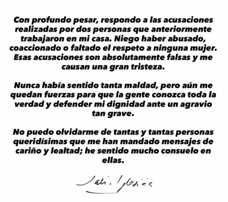 Στην ανάρτησή του ο Ιγκλέσιας εξέφρασε τη βαθιά του θλίψη, τονίζοντας πως στην εξηκονταετή καριέρα του δεν έχει κακοποιήσει ή εξαναγκάσει ποτέ καμία γυναίκα.