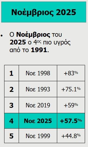 Οσον αφορά στο ύψος βροχής, το 2025 ήταν κοντά στη μέση τιμή των τελευταίων 30 ετών (15o στην κατάταξη).