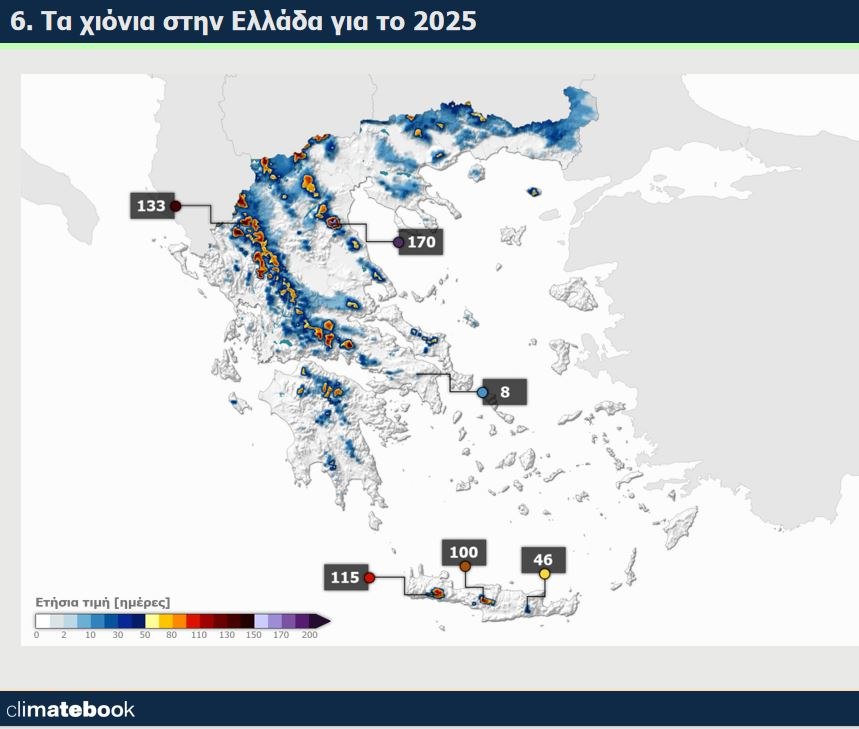 Συνολικά, το 2025 σημειώθηκαν 170 ημέρες χιονόπτωσης στον Ολυμπο και 130 στην Πίνδο. Χαμηλός ήταν ο αριθμός ημερών χιονοκάλυψης στην Κρήτη με 100 ημέρες στα Λευκά Όρη.