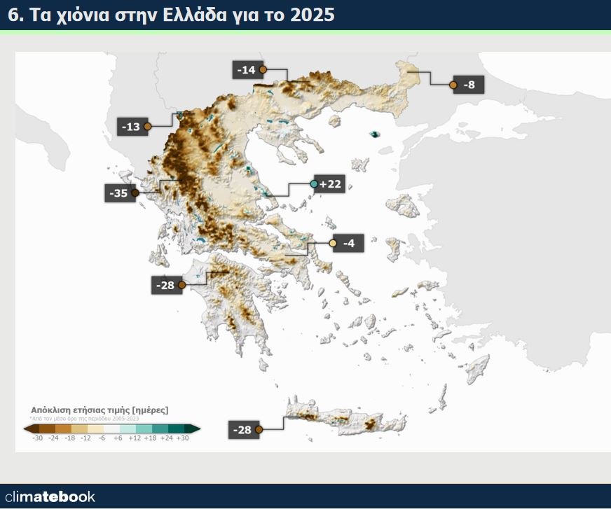 Οι ημέρες χιονοκάλυψης στη χώρα το 2025 ήταν σημαντικά περιορισμένες κατά 35-30% στη Βόρεια Ελλάδα και στην Πίνδο, κάτω από τον μέσο όρο των ετών 2005-2024 .