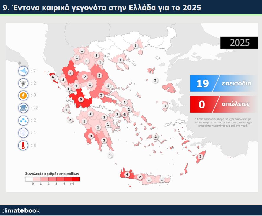 Το 2025 σημειώθηκαν στην Ελλάδα 19 καιρικά επεισόδια με έντονες κοινωνικές και οικονομικές επιπτώσεις . Ο αριθμός αυτός είναι χαμηλότερος από τον ετήσιο μέσο όρο της περιόδου 2000-2025 (~24 επεισόδια).
