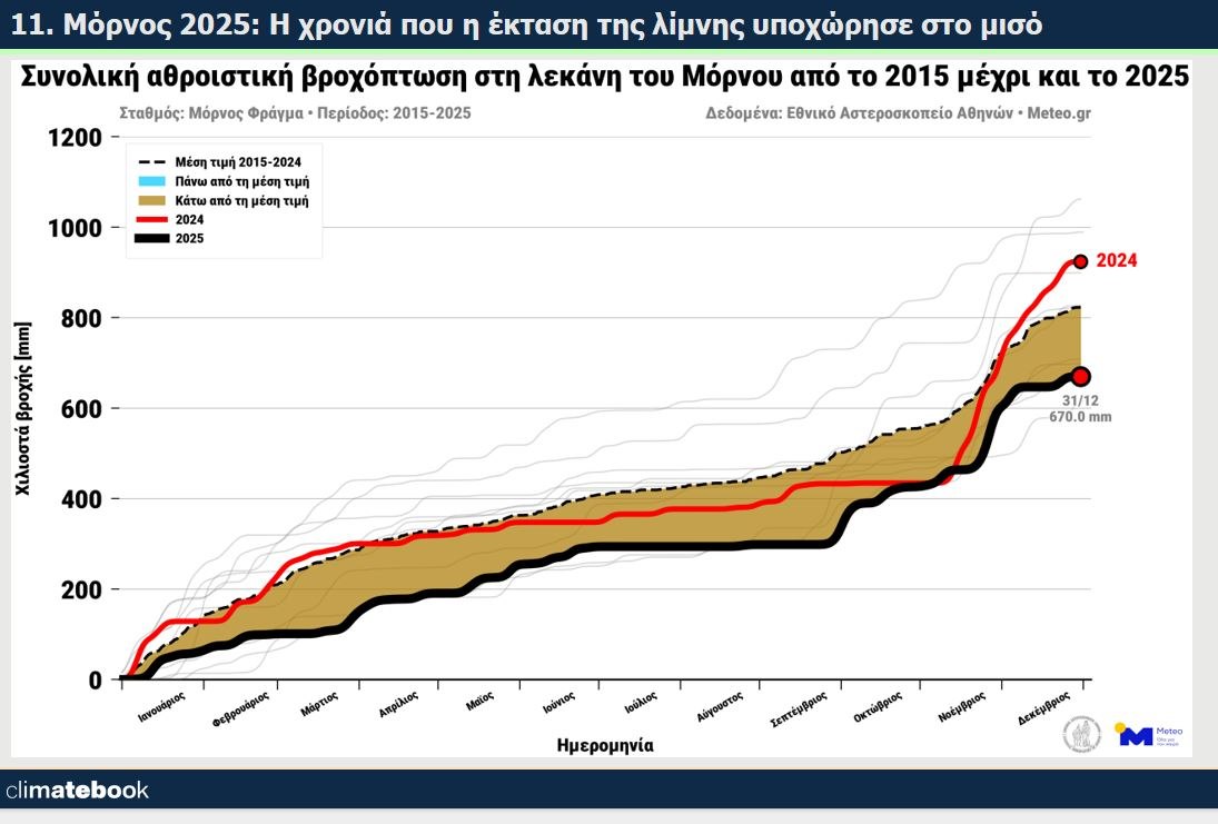 Ξεχωριστό κεφάλαιο της κλιματικής απότιμησης του 2025 στην Ελλάδα είναι και η δραμτική συρρίκνωση του Μόρνου- στη μισή έκταση- μέσα σε τρία χρόνια.