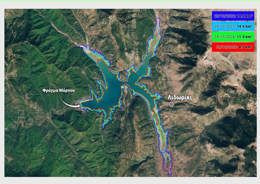 Κατά το 2025, η συρρίκνωση της λίμνης κορυφώθηκε, με την έκταση στις 09/10/2025 (κόκκινο χρώμα) να περιορίζεται στα 8.3 km², τιμή που αντιστοιχεί σε μείωση περίπου 49% σε σύγκριση με τον Οκτώβριο του 2022 και αποτελεί τη μικρότερη καταγεγραμμένη έκταση της τελευταίας τετραετίας. Η εικόνα συνοψίζει με χαρακτηριστικό τρόπο τις υδρολογικές συνθήκες που επικράτησαν το 2025 στη λεκάνη απορροής του Μόρνου και αναδεικνύει τη σωρευτική επίδραση των χαμηλών βροχοπτώσεων και της μειωμένης χιονοκάλυψης στην κατάσταση του ταμιευτήρα.