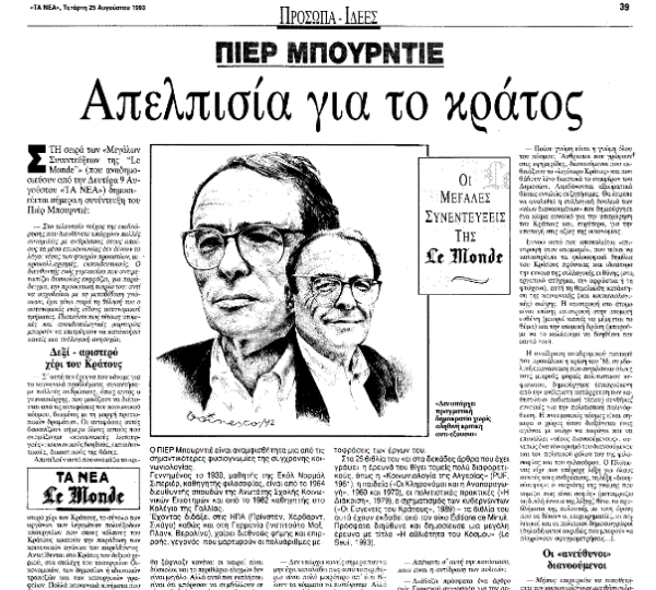 Στο φύλλο των «Νέων» που είχε κυκλοφορήσει την Τετάρτη 25 Αυγούστου 1993, και στο πλαίσιο μιας σειράς επιλεκτικών αναδημοσιεύσεων από τη Le Monde (επρόκειτο για έναν κύκλο «Μεγάλων Συνεντεύξεων» της παρισινής εφημερίδας), είχε φιλοξενηθεί μια πολύ ενδιαφέρουσα συνέντευξη του Πιερ Μπουρντιέ («Απελπισία για το κράτος» ήταν ο τίτλος της), η οποία παρατίθεται κατωτέρω.