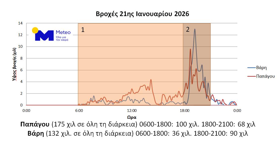 Στο σταθμό του Παπάγου (ο όποιος βρίσκεται επί της δυτικής περιφερειακής Υμηττού) είχαν καταγραφεί στο δωδεκάωρο από τις 06:00 ως τις 18:00 100 χιλιοστά βροχής ενώ σε άλλους σταθμούς της περιοχής 60-70 χιλιοστά.