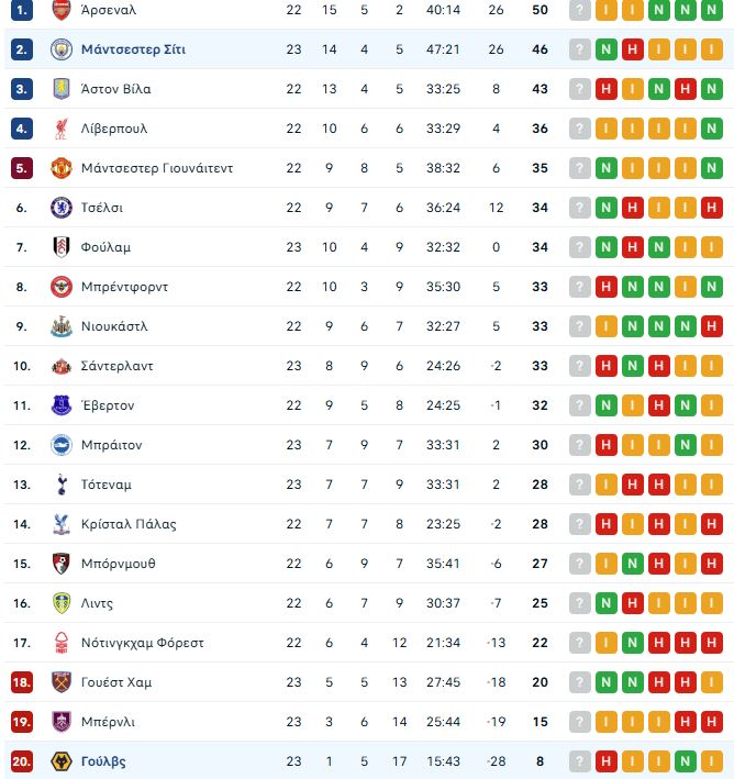 Η Μάντσεστερ Σίτι νίκησε με 2-0 την Γουλβς για την 23η αγωνιστική της Premier League, ενώ η Τότεναμ δεν κατάφερε να νικήσει ούτε την Μπέρνλι φέρνοντας ισοπαλία με 2-2. Η βαθμολογία και τα αποτελέσματα της αγωνιστικής.