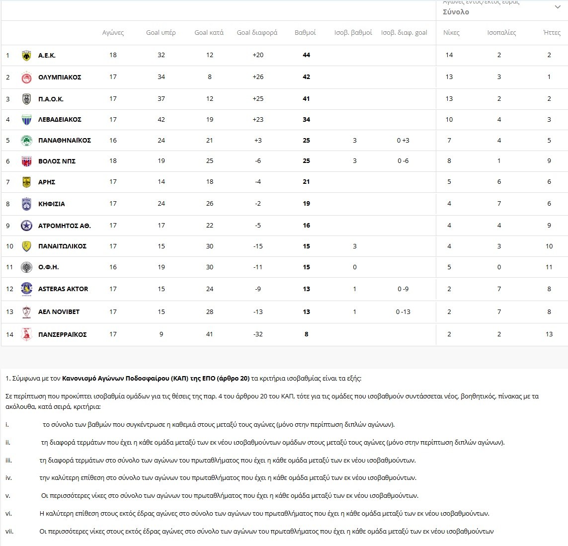 Μετά τα αποψινά αποτελέσματα, η ΑΕΚ βρίσκεται στην πρώτη θέση με 44 βαθμούς και ο Ολυμπιακός στη δεύτερη με 42, έχοντας όμως ένα παιχνίδι λιγότερο, καθώς εκκρεμεί το ματς με τον Αστέρα στην Τρίπολη. Την επόμενη Κυριακή (1/2, 21:00) μάλιστα οι Κιτρινόμαυροι κοντράρονται με τους Ερυθρόλευκους στη Νέα Φιλαδέλφεια, στο σημαντικότερο παιχνίδι της 19ης αγωνιστικής.