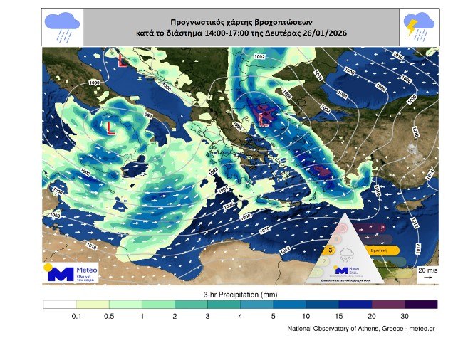 Όπως αναφέρει το Εθνικό Αστεροσκοπείο Αθηνών / meteo.gr, ο καιρός θα παρουσιάσει επιδείνωση τη Δευτέρα 26/01 από τα δυτικά με βροχές και καταιγίδες, οι οποίες θα είναι κατά τόπους ισχυρές. Τοπικά θυελλώδεις νότιοι άνεμοι θα πνέουν στο Αιγαίο.