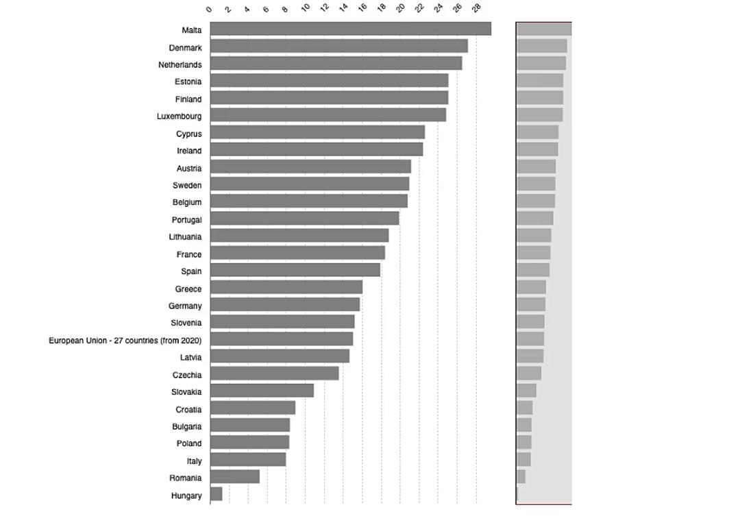 Και πάλι, στο τέλος της λίστας βρίσκονται η Ουγγαρία (1,31%), η Ρουμανία (5,24%), η Ιταλία (8,00%), η Πολωνία (8,36%) και η Βουλγαρία (8,43%). Η Μάλτα προηγείται με 29,64%, ακολουθούμενη από τη Δανία (27,17%), την Ολλανδία (26,56%), την Εσθονία (25,12%) και τη Φινλανδία (25,11%).