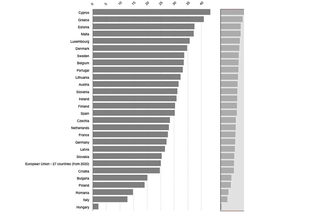 Η Κύπρος προηγείται με 43,13%, ακολουθούμενη από την Ελλάδα (40,91%), την Εσθονία (37,47%), τη Μάλτα (37,20%) και το Λουξεμβούργο (35,71%). Η Ουγγαρία βρίσκεται, για άλλη μια φορά, στο τέλος με μόνο 2,12%, ακολουθούμενη από την Ιταλία (12,81%), τη Ρουμανία (14,85%), την Πολωνία (19,13%) και τη Βουλγαρία (20,15%).