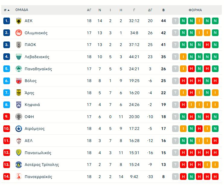 Μετά τα αποτελέσματα της 18ης αγωνιστικής, η ΑΕΚ βρίσκεται στην πρώτη θέση με 44 βαθμούς. Ακολουθεί ο Ολυμπιακός με 42 σε 17 ματς (σ.σ εκκρεμεί ο αγώνας με τον Αστέρα στην Τρίπολη), ο ΠΑΟΚ με 41, επίσης σε 17 αναμετρήσεις και ο Λεβαδειακός με 35. Ο Παναθηναϊκός έχει 26 σε 17 ματς και κάνει αγώνα δρόμου για να προλάβει την τετράδα.