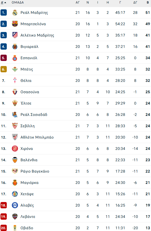 Επιστροφή στην κορυφή για τη Ρεάλ με 51 βαθμούς, έστω και προσωρινά, καθώς η Μπαρτσελόνα των 49 πόντων αγωνίζεται το απόγευμα της Κυριακής (25/1, 17:15) εντός έδρας με την Οβιέδο.