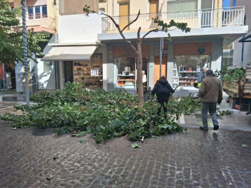 Στο κέντρο του Ηρακλείου τα συνεργεία του δήμου προχώρησαν σε κοπές δέντρων για λόγους ασφαλείας.