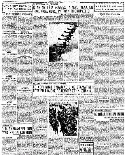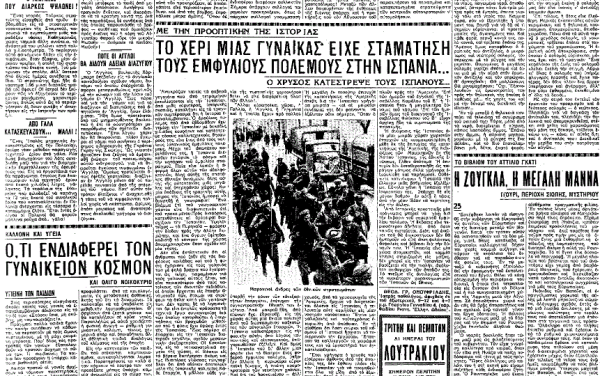 *Άρθρο που αφορούσε τον Ισπανικό Εμφύλιο των ετών 1936-1939, καθώς και το ιστορικό υπόβαθρο αυτού. Έφερε τον τίτλο «Το χέρι μιας γυναίκας είχε σταματήση τους εμφύλιους πολέμους στην Ισπανία…» και είχε δημοσιευτεί στην εφημερίδα «Αθηναϊκά Νέα» την Πέμπτη 26 Νοεμβρίου 1936.