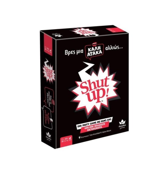 Ένα παιχνίδι γεμάτο έξυπνες… (ή και όχι) ατάκες. Διάβασε μία διαφορετική δήλωση σε κάθε παίκτη. Οι υπόλοιποι πρέπει να απαντήσουν με την καλύτερη ατάκα που έχουν. Έπιασε η ατάκα τους; Καλώς. Δεν δούλεψε; Απλά, πες τους …Shut up. Ιδανικό για ενήλικες που θέλουν να χαλαρώσουν και να γελάσουν χωρίς φίλτρα.