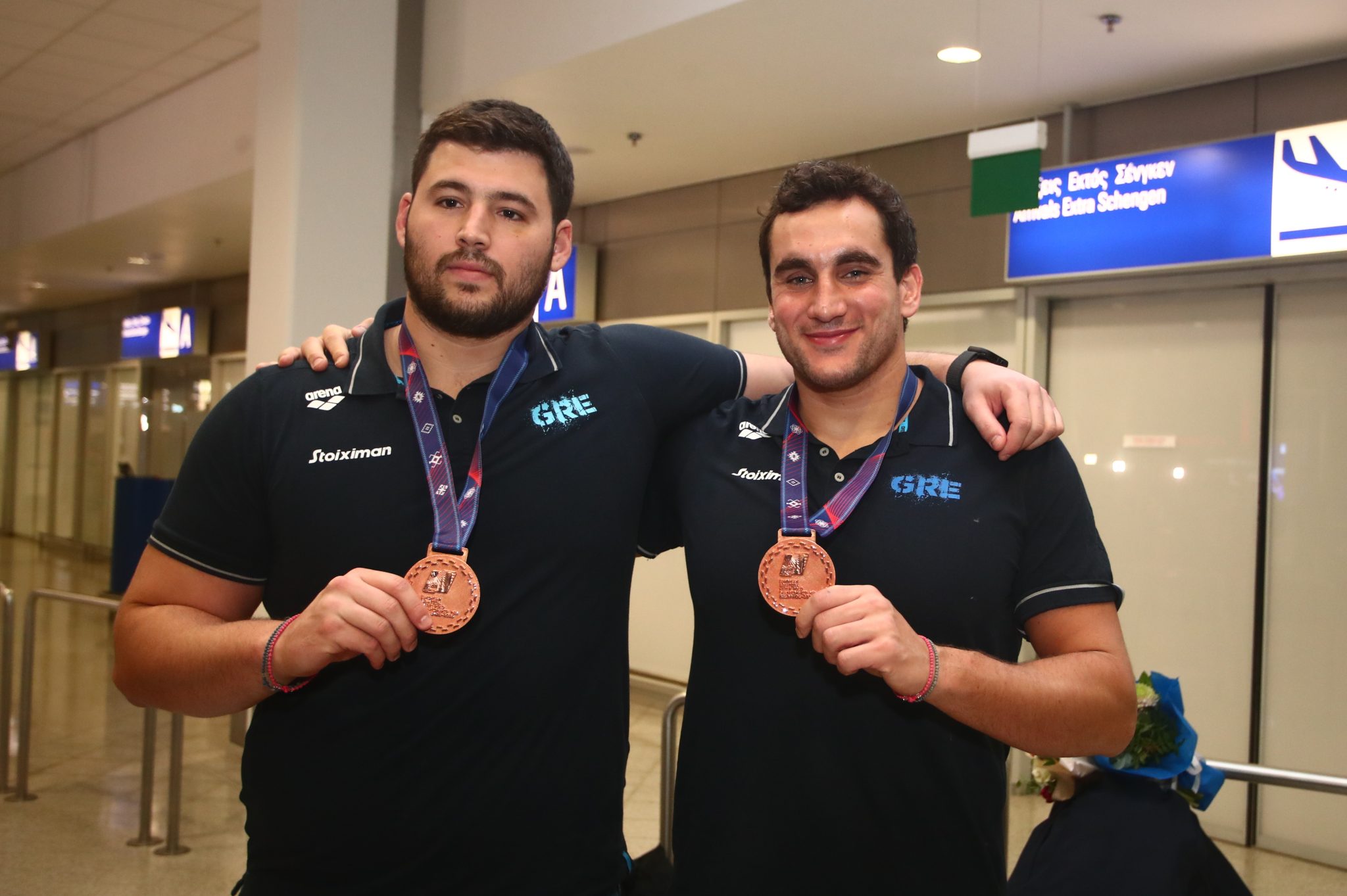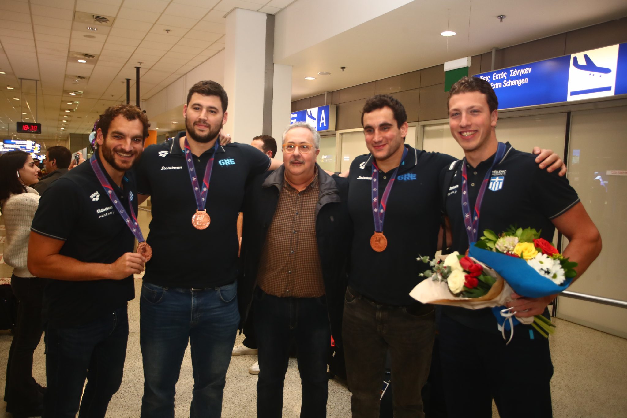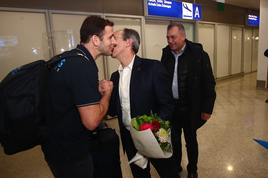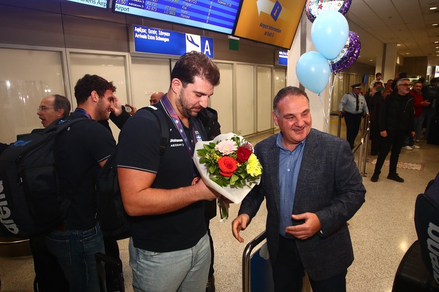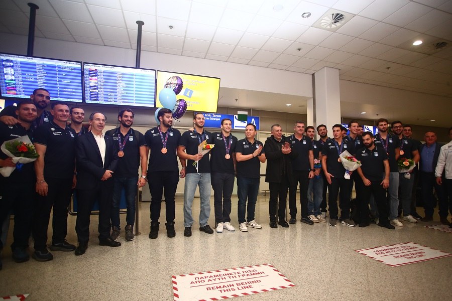 Ο Θοδωρής Βλάχος και οι παίκτες του έφτασαν χαμογελαστοί και φυσικά φορώντας το μετάλλιο στο στήθος, το οποίο ήταν το πρώτο για το αντιπροσωπευτικό συγκρότημα των ανδρών στην ιστορία σε αυτή τη διοργάνωση.