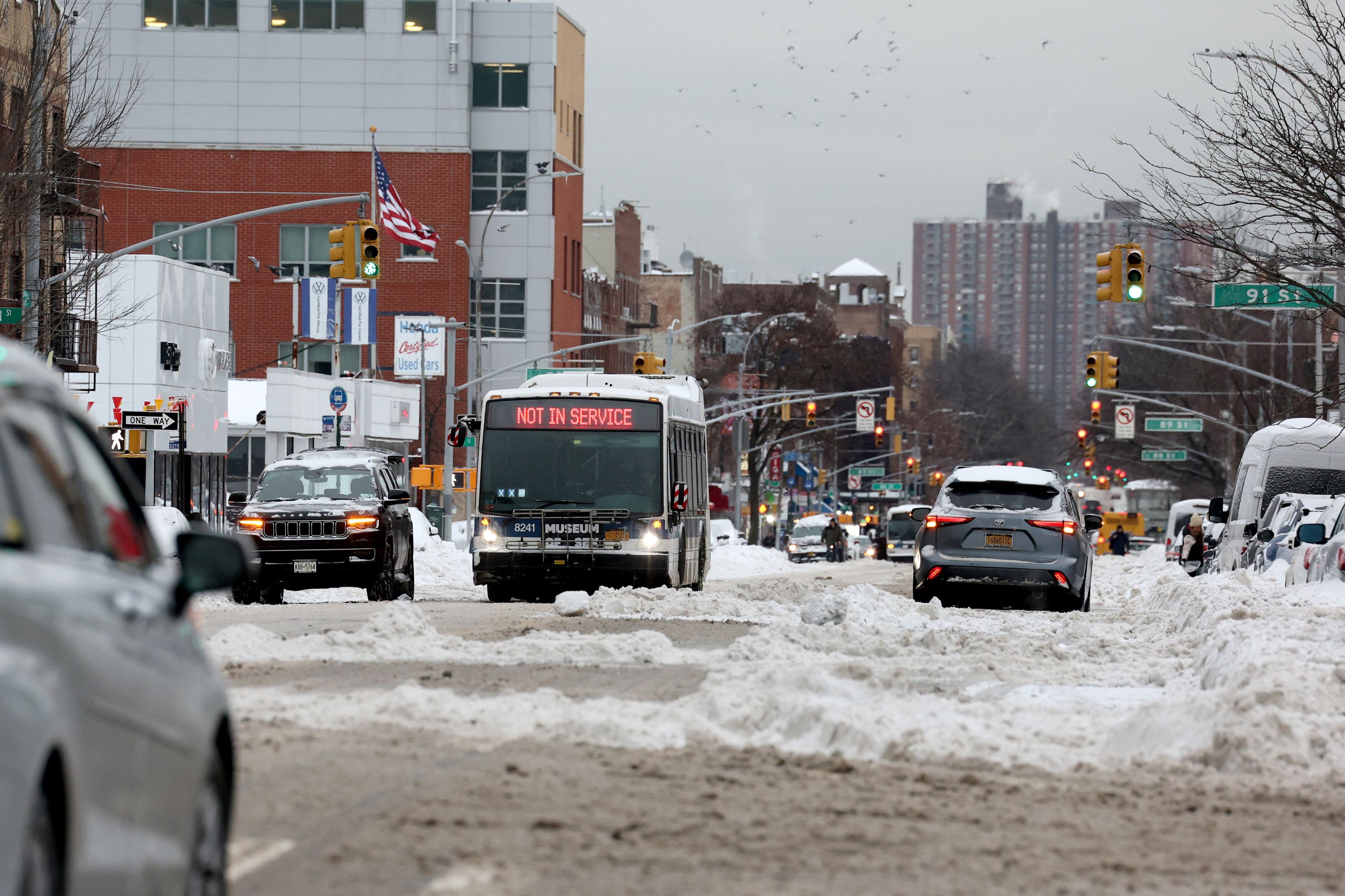Η Νέα Υόρκη έχει υποστεί το μεγαλύτερο μέρος της αναστάτωσης από τη χιονοκαταιγίδα, με 379 πτήσεις να ακυρώνονται και περισσότερες από 30 να έχουν καθυστερήσει στα αεροδρόμια JFK, LaGuardia και Newark.