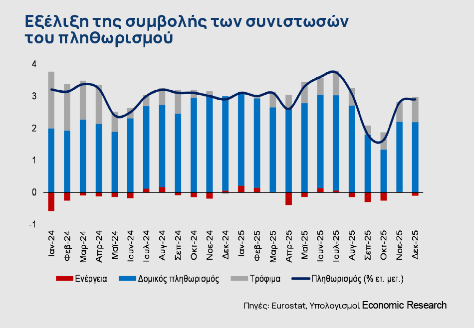Στη διατήρηση των πληθωριστικών πιέσεων συνέβαλε κυρίως η επιτάχυνση της ανόδου των τιμών των υπηρεσιών (4,8% έναντι 4,4% το 2024). Αντίθετα, τόσο οι τιμές των βιομηχανικών αγαθών εκτός ενέργειας (0,7% έναντι 1,7% το 2024) όσο και τιμές των τροφίμων (2,1% έναντι 2,8% το 2024) αυξήθηκαν το 2025 ηπιότερα. Τέλος, οι τιμές της ενέργειας μειώθηκαν για τρίτο διαδοχικό έτος, με επιβραδυνόμενο, ωστόσο, ρυθμό (-0,7% έναντι -1,4% το 2024).