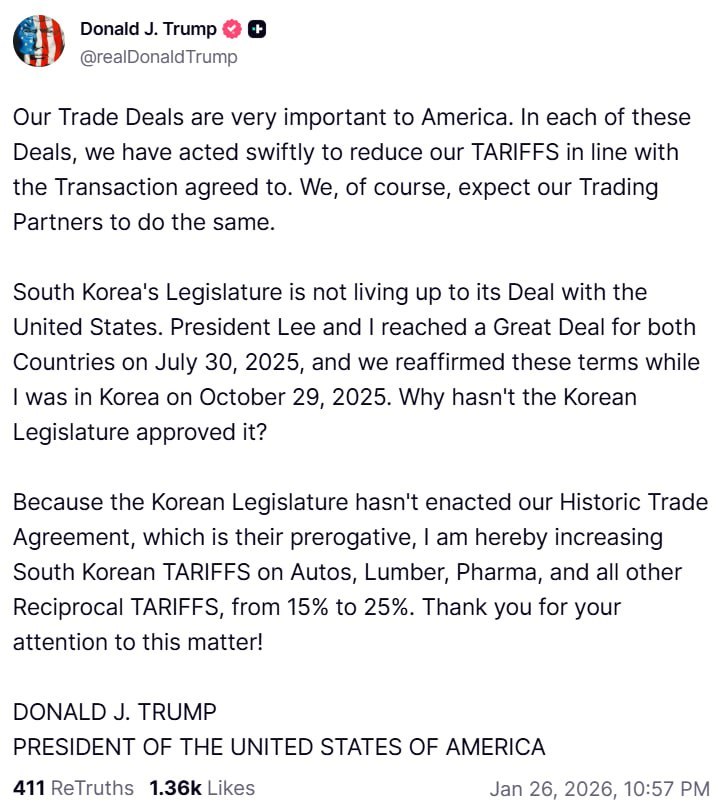 Ο Ντόναλντ Τραμπ, υπογράμμισε στην ανάρτησή του πως η συμφωνία έγινε με τον πρόεδρο Λι στα τέλη Ιουλίου και οι ίδιοι όροι επιβεβαιώθηκαν στην επίσκεψή του στην χώρα στις 29 Οκτωβρίου, εκφράζοντας την απορία γιατί δεν έχει εγκριθεί η συμφωνία από το κοινοβούλιο της Νότιας Κορέας.
