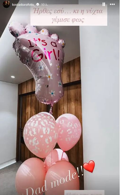 Την ευχάριστη είδηση ανακοίνωσε στα social media το πρωί της Τετάρτης 28 Ιανουαρίου ο τραγουδιστής, δημοσιεύοντας φωτογραφία με τα ροζ μπαλόνια στο μαιευτήριο.