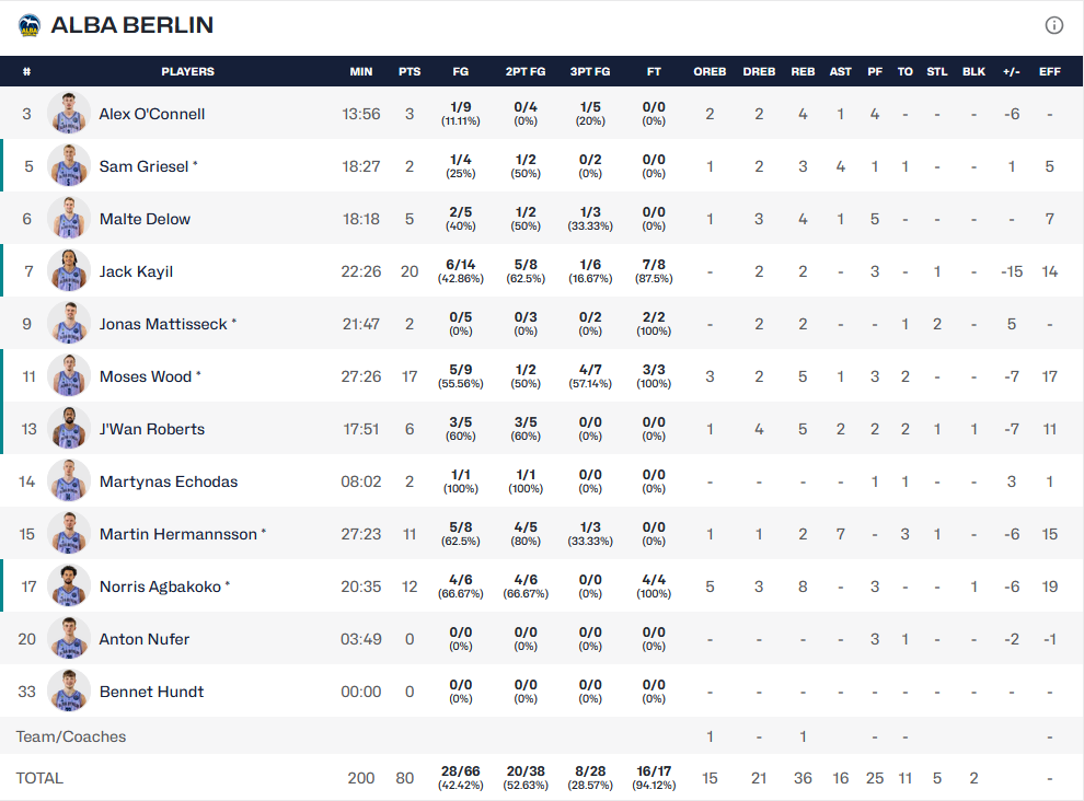 Κορυφαίος για την ΑΕΚ ήταν ο Μπάρτλεϊ με 26 πόντους, 4 ριμπάουντ και 4 ασίστ ενώ ο Γκρέι είχε 16 πόντους. Καθοριστική συμβολή στην ανατροπή είχε και ο Χαραλαμπόπουλος που τα έδωσε όλα στο τέλος και σταμάτησε στους 13 πόντους με 4 ριμπάουντ. Για την Άλμπα ο Καγίλ με 20 πόντους ήταν αυτός που ξεχώρισε, αλλά δεν ήταν αρκετός για την ομάδα του.