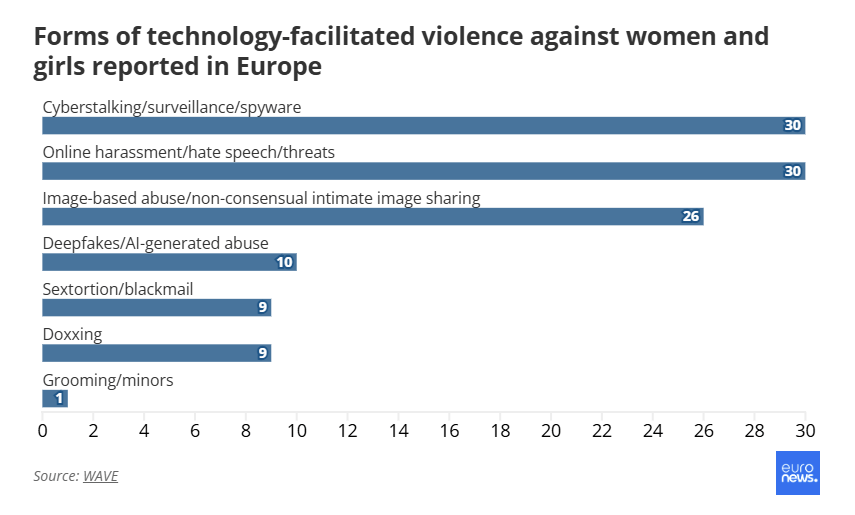Σε ολόκληρη την Ευρώπη, η διαδικτυακή παρενόχληση, η παρακολούθηση και η χρήση λογισμικού υποκλοπής δεδομένων ήταν οι πιο συνηθισμένες μορφές διαδικτυακής βίας που αναφέρθηκαν από γυναίκες και κορίτσια, σύμφωνα με την τελευταία έκθεση της Women Against Violence Europe (WAVE).