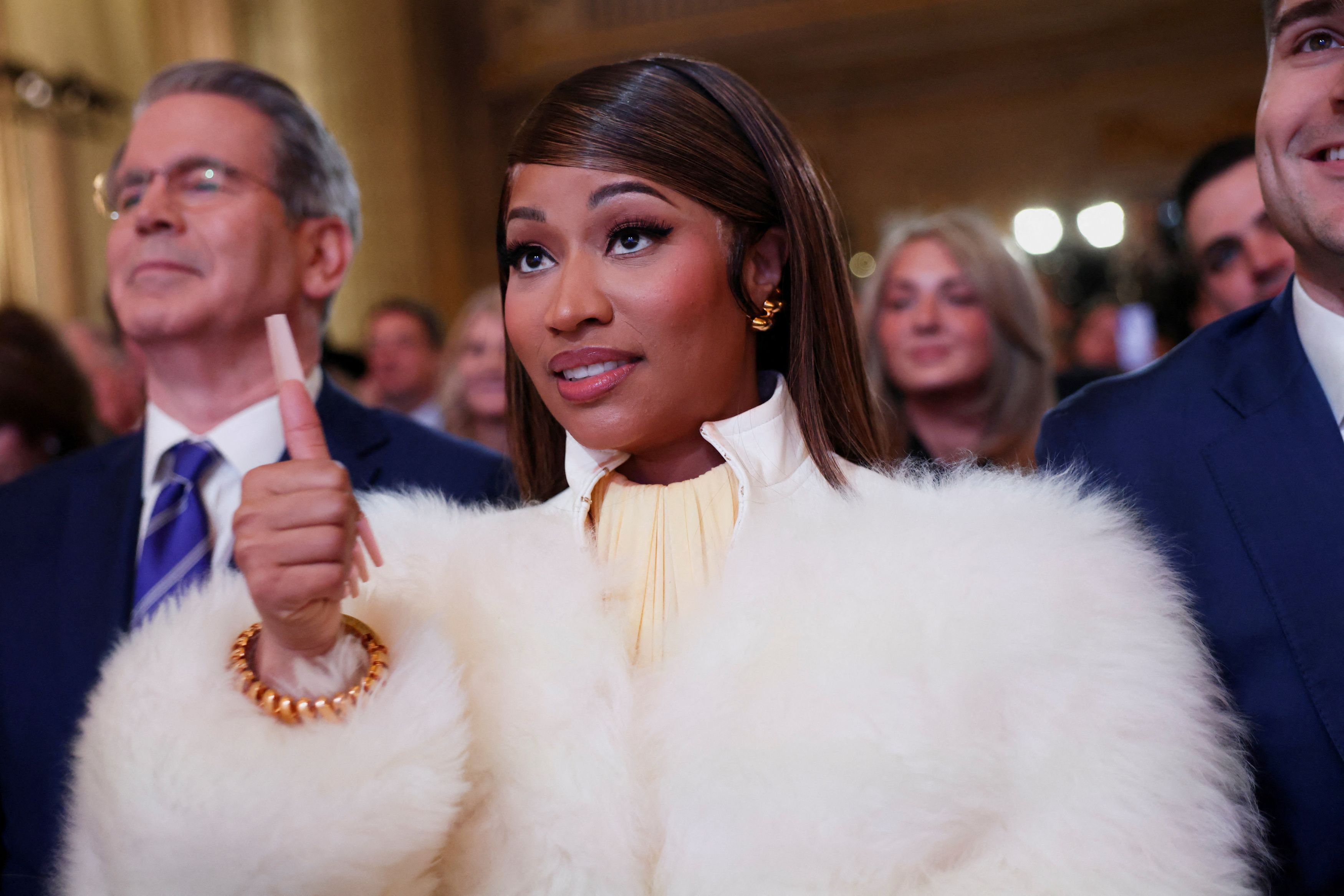 Η μουσικός Νίκι Μινάζ κάνει το σήμα του «μπράβο» με τον αντίχειρα, καθώς παρευρίσκεται στη Σύνοδο «Trump Accounts» του Υπουργείου Οικονομικών των ΗΠΑ, στην Ουάσινγκτον, D.C., ΗΠΑ, 28 Ιανουαρίου 2026. REUTERS/Kevin Lamarque