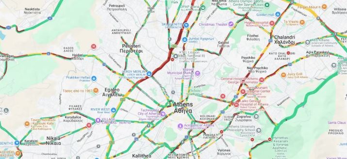 Στο «κόκκινο» είναι η κίνηση στον Κηφισό το ρεύμα προς το Φάληρο από τον κόμβο Μεταμόρφωσης έως τον Αιγάλεω.