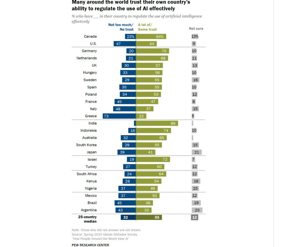 Στις 25 χώρες που συμμετείχαν στην έρευνα του Pew research center κατά μέσο όρο το 55% των ενηλίκων έχει τουλάχιστον κάποια εμπιστοσύνη στην ικανότητα της χώρας του να ρυθμίσει την τεχνητή νοημοσύνη, ενώ το 32% δεν έχει.