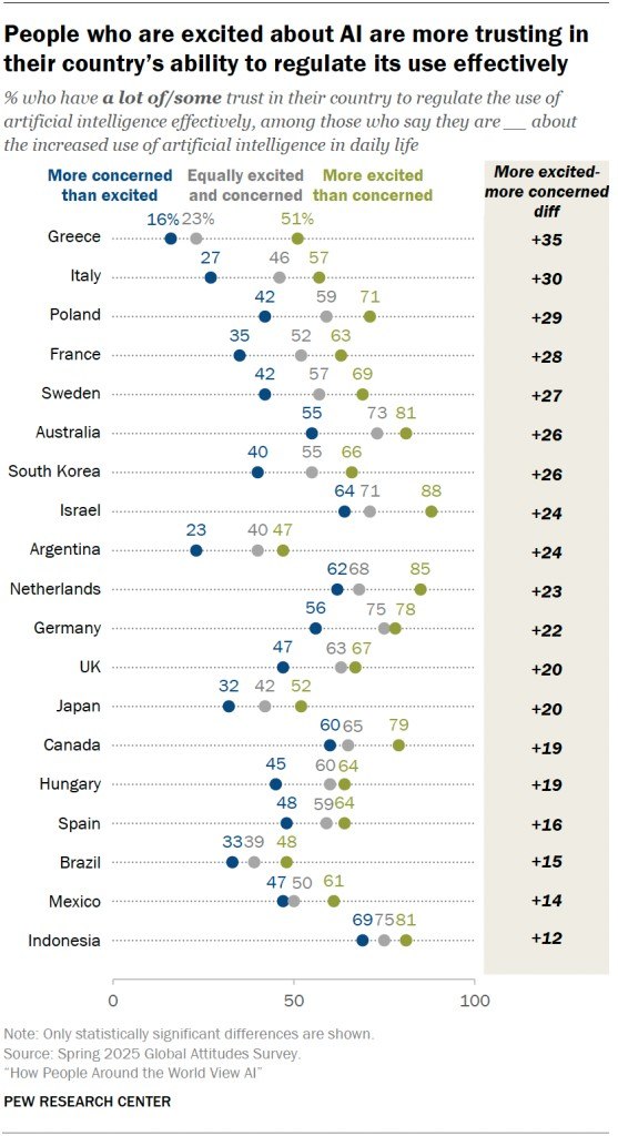 Σε 19 χώρες, τα άτομα που είναι περισσότερο ενθουσιασμένα, παρά ανησυχούν για την αυξημένη χρήση της τεχνητής νοημοσύνης στην καθημερινή ζωή, είναι πιο πιθανό να εμπιστεύονται τη χώρα τους για την αποτελεσματική ρύθμιση της τεχνολογίας, σε σύγκριση με εκείνα που ανησυχούν περισσότερο από ό,τι ενθουσιάζονται.