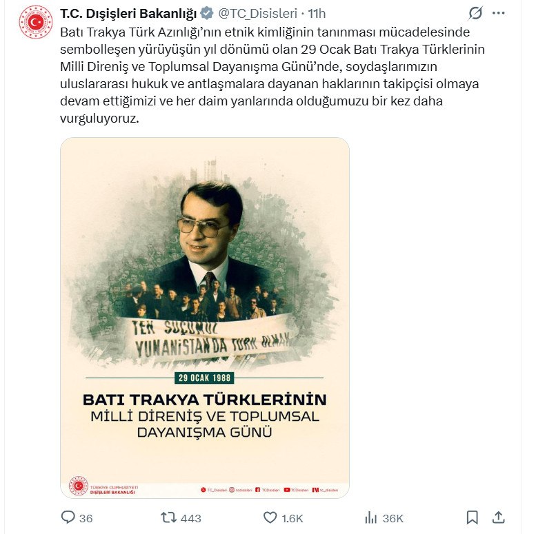 Το τουρκικό Υπουργείο Εξωτερικών με ανάρτηση στου στο «X» αναφέρει «στις 29 Ιανουαρίου, την επέτειο της πορείας που έχει συμβολίσει τον αγώνα για την αναγνώριση της εθνικής ταυτότητας της τουρκικής μειονότητας της Δυτικής Θράκης, την Ημέρα Εθνικής Αντίστασης και Κοινωνικής Αλληλεγγύης των Τούρκων της Δυτικής Θράκης, τονίζουμε για άλλη μια φορά ότι θα συνεχίσουμε να υποστηρίζουμε τα δικαιώματα των συμπατριωτών μας, τα οποία βασίζονται στο διεθνές δίκαιο και τις διεθνείς συμφωνίες, και ότι θα είμαστε πάντα στο πλευρό τους».