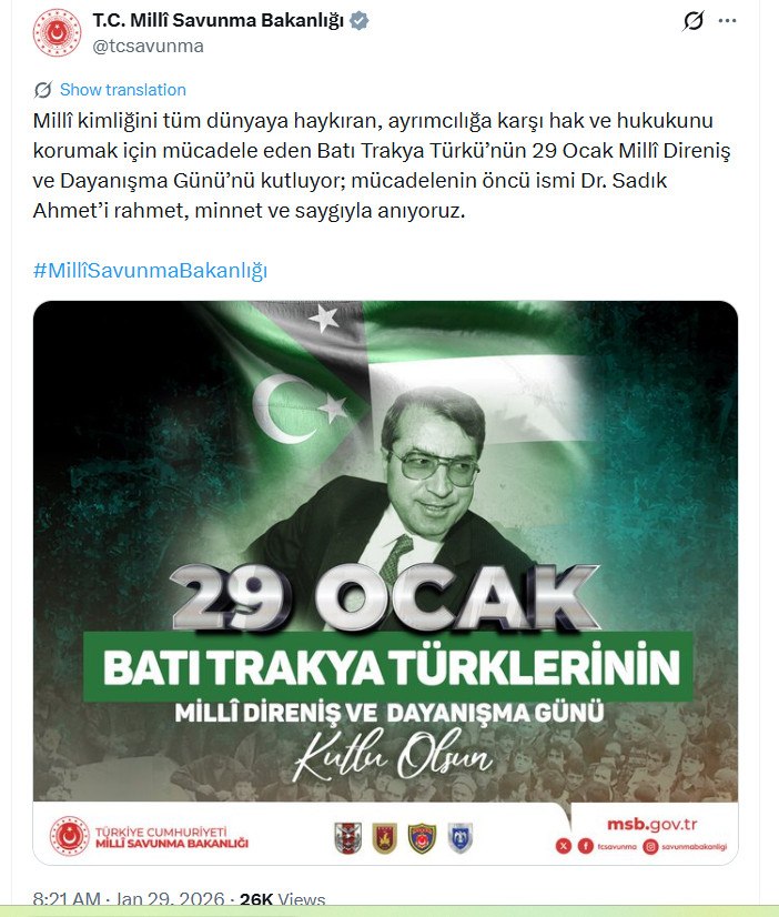 Αντίστοιχη ανάρτηση έχει κάνει όπως κάθε χρόνο και το τουρκικό Υπουργείο Άμυνας, στην οποία υποστηρίζει ότι «γιορτάζουμε την 29η Ιανουαρίου, Ημέρα Εθνικής Αντίστασης και Αλληλεγγύης, των Τούρκων της Δυτικής Θράκης, που διακηρύσσουν την εθνική τους ταυτότητα σε ολόκληρο τον κόσμο και αγωνίζονται για την προστασία των δικαιωμάτων και των νόμων τους ενάντια στις διακρίσεις. Τιμούμε με ευγνωμοσύνη, σεβασμό και ευγνωμοσύνη τον πρωτοπόρο του αγώνα, Δρ. Σαδίκ Αχμέτ».