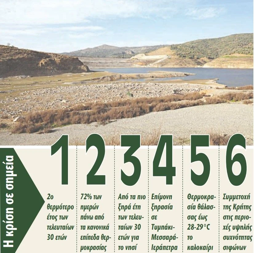 Η έντονη ξηρασία, οι αυξημένες θερμοκρασίες, τα επεισόδια ισχυρών ανέμων και σιφώνων, οι υδροστρόβιλοι και η αυξημένη πίεση στα υπόγεια νερά, είναι όσα έγιναν την προηγούμενη χρονιά στην Κρήτη, όπως αποτυπώνονται στα επιστημονικά δεδομένα της ετήσιας κλιματικής αποτίμησης του κόμβου πληροφόρησης Climatebook.gr.