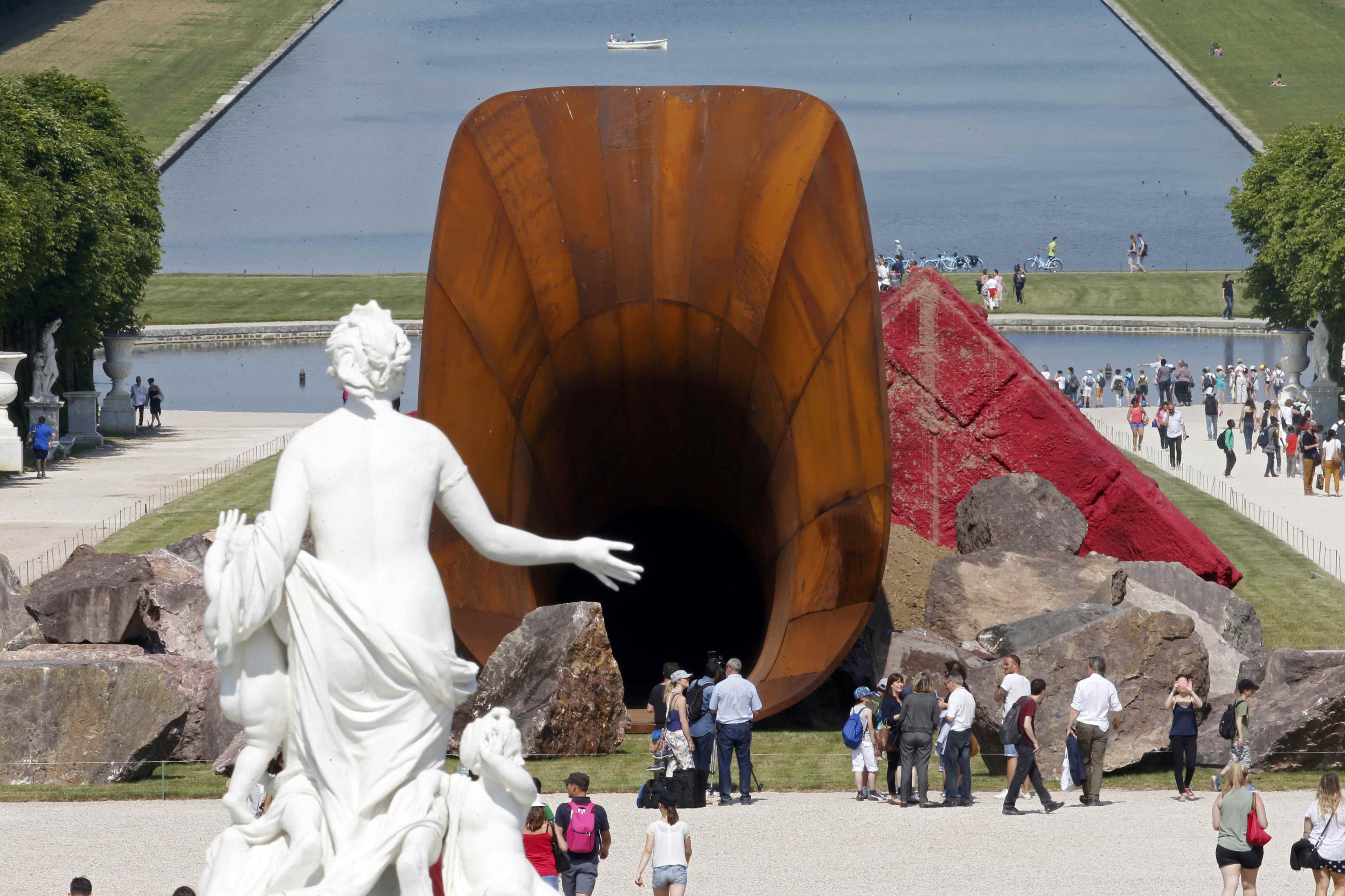 Άνθρωποι περπατούν κοντά στο έργο «Dirty Corner» του Βρετανού καλλιτέχνη ινδικής καταγωγής Anish Kapoor — μια μνημειακή δημιουργία του 2011 από ατσάλι Cor-Ten, χώμα και μεικτά υλικά — που έχει τοποθετηθεί στους κήπους του Παλατιού των Βερσαλλιών, στις Βερσαλλίες της Γαλλίας, στις 5 Ιουνίου 2015. Η έκθεση «Kapoor Versailles» με έργα του καλλιτέχνη διήρκεσε από 9 Ιουνίου έως 1 Νοεμβρίου. REUTERS/Charles Platiau