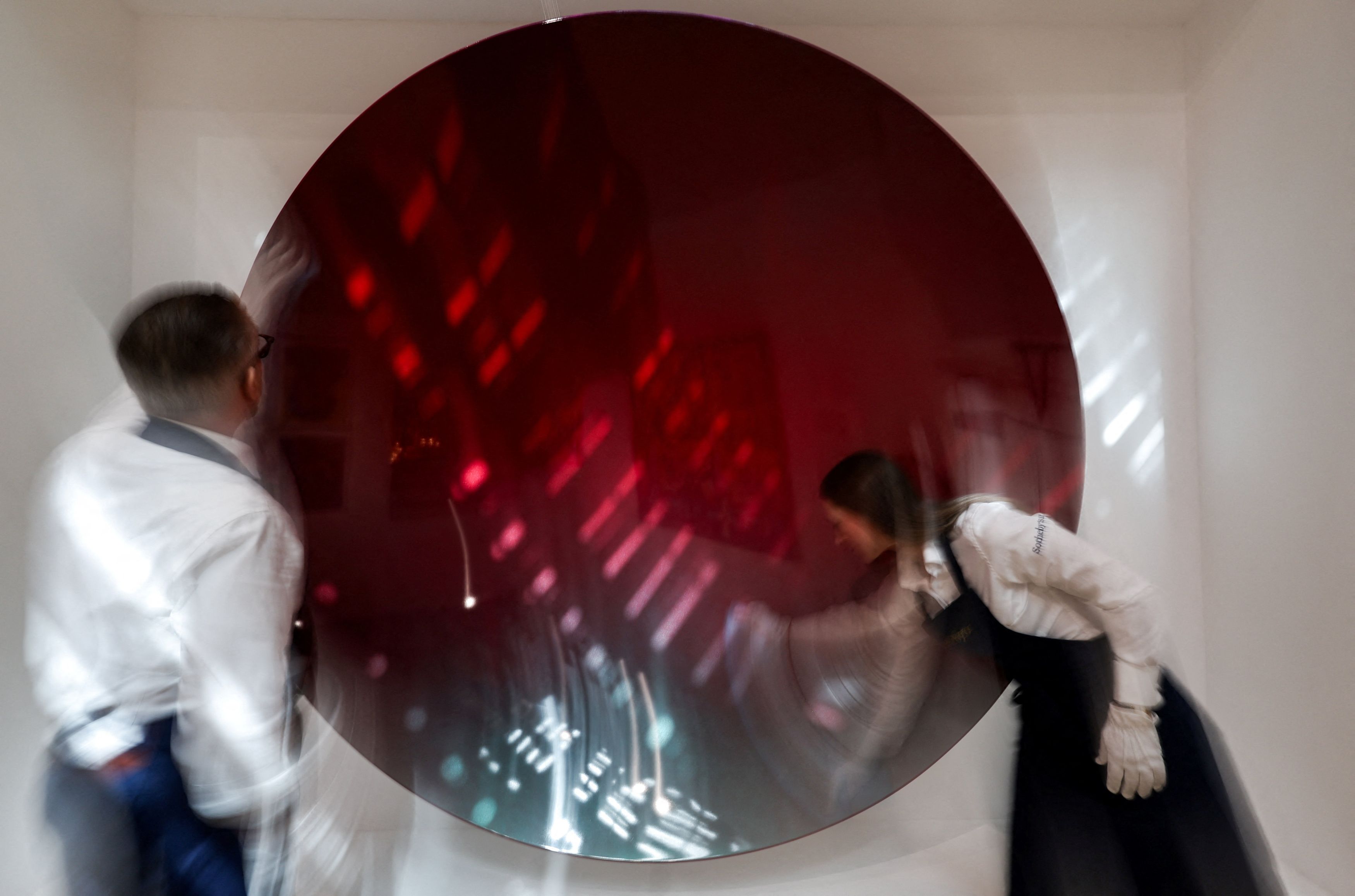 Μέλη του προσωπικού καθαρίζουν έργο τέχνης του Anish Kapoor που εκτίθεται προς δημοπράτηση στην έκθεση «Origins II» του οίκου Sotheby’s στο Ριάντ της Σαουδικής Αραβίας, 25 Ιανουαρίου 2026. REUTERS/Hamad I Mohammed