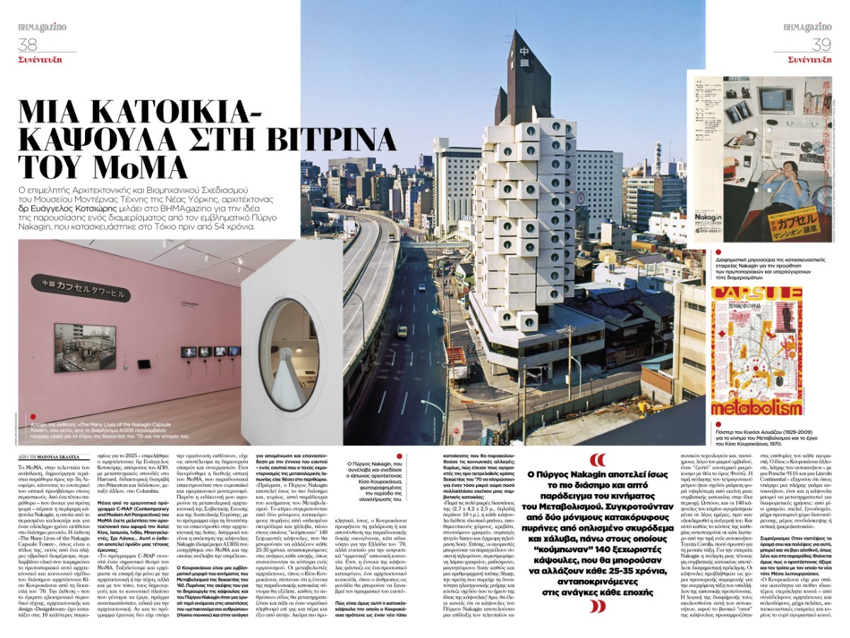 Ξεχωριστή θέση κατέχει η συνέντευξη του αρχιτέκτονα δρ. Ευάγγελου Κοτσιώρη, επιμελητή Αρχιτεκτονικής και Βιομηχανικού Σχεδιασμού του MoMA, που μιλά για την παρουσίαση μιας εμβληματικής κατοικίας-κάψουλας από τον Πύργο Nakagin του Τόκιο στη βιτρίνα του Μουσείου Μοντέρνας Τέχνης της Νέας Υόρκης.