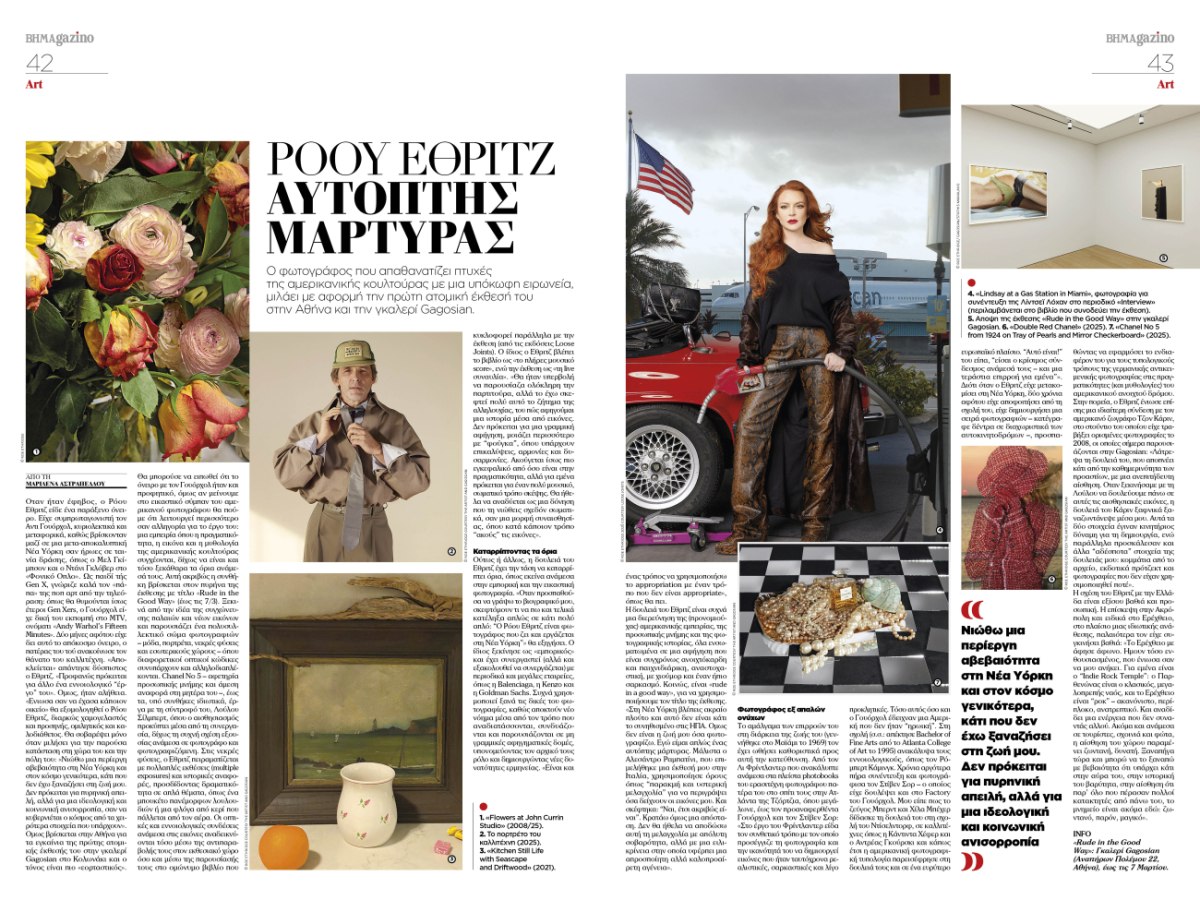 Τέλος, ο Ρόουζ Εθριτζ, ο φωτογράφος που καταγράφει την αμερικανική κουλτούρα με μια υπόκωφη ειρωνεία, μιλά με αφορμή την πρώτη ατομική του έκθεση στην Αθήνα, στη γκαλερί Gagosian.