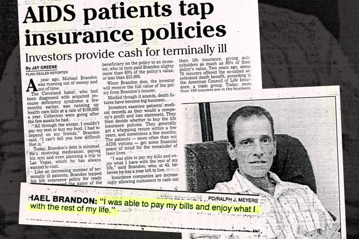 Ένας ασθενής με AIDS, ο οποίος γνώριζε ότι έχει λίγους μήνες ζωής, πωλούσε το συμβόλαιο της ασφάλειας ζωής του σε έναν τρίτο επενδυτή. Αν το συμβόλαιο προέβλεπε αποζημίωση 100.000 δολαρίων μετά τον θάνατό του, ο επενδυτής του έδινε, για παράδειγμα, 60.000 δολάρια «στο χέρι» εκείνη τη στιγμή.