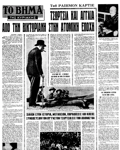 Στο φύλλο του «Βήματος» που είχε κυκλοφορήσει την επομένη της κηδείας του Τσώρτσιλ, την Κυριακή 31 Ιανουαρίου 1965, υπήρχε εκτενής περιγραφή της τελετής αποχαιρετισμού, στο πλαίσιο ενός ολοσέλιδου δημοσιεύματος που ήταν αφιερωμένο στον εκλιπόντα.