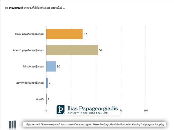 Το 89% των πολιτών θεωρεί το Στεγαστικό πρόβλημα ως «αρκετά μεγάλο / πολύ μεγάλο πρόβλημα», ενώ ένα ακόμη 10% το θεωρεί «μικρό πρόβλημα». Αυτά τα αποτελέσματα παραμένουν σταθερά σε όλα τα «Βαρόμετρα» και καταδεικνύουν την ένταση του προβλήματος.