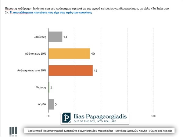Στην ερώτηση για τις επιπτώσεις του προγράμματος αυτού στα ενοίκια των κατοικιών, το 82% εκτίμησε ότι οδήγησαν σε άνοδο ως 10% ή πάνω από 10%, με το 13% να δηλώνει πως οι τιμές έμειναν σταθερές και το 1% να λέει πως αυτές μειώθηκαν. Στην ομάδα αυτών που δηλώνουν αγοραστές και αναζητούν κατοικία το ποσοστό αυτό φτάνει το 87%.
