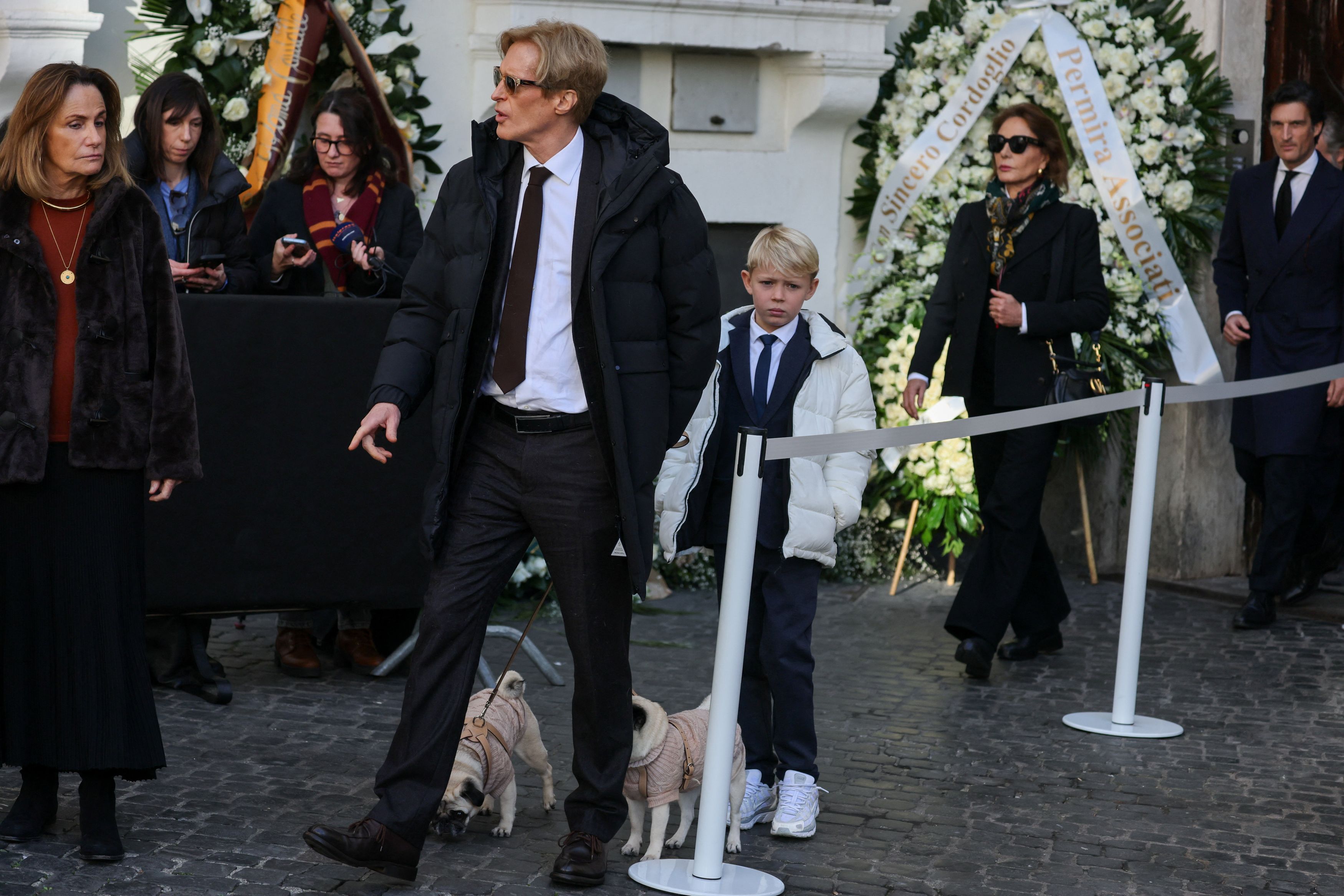 Ο Bruce Hoeksema, ο τελευταίος σύντροφος του αείμνηστου σχεδιαστή μόδας Valentino Garavani, φεύγει με τα δύο μπουλντόγκ τους, ακολουθούμενος από ένα παιδί, στην κηδεία του Valentino στη Ρώμη, στις 22 Ιανουαρίου 2026. REUTERS/Yara Nardi